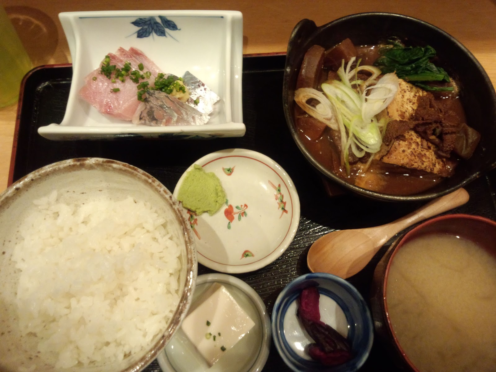 今日は寒ブリとあじの刺身と黒毛和牛ホルモンと焼き豆腐の赤みそ鍋にしてみました。